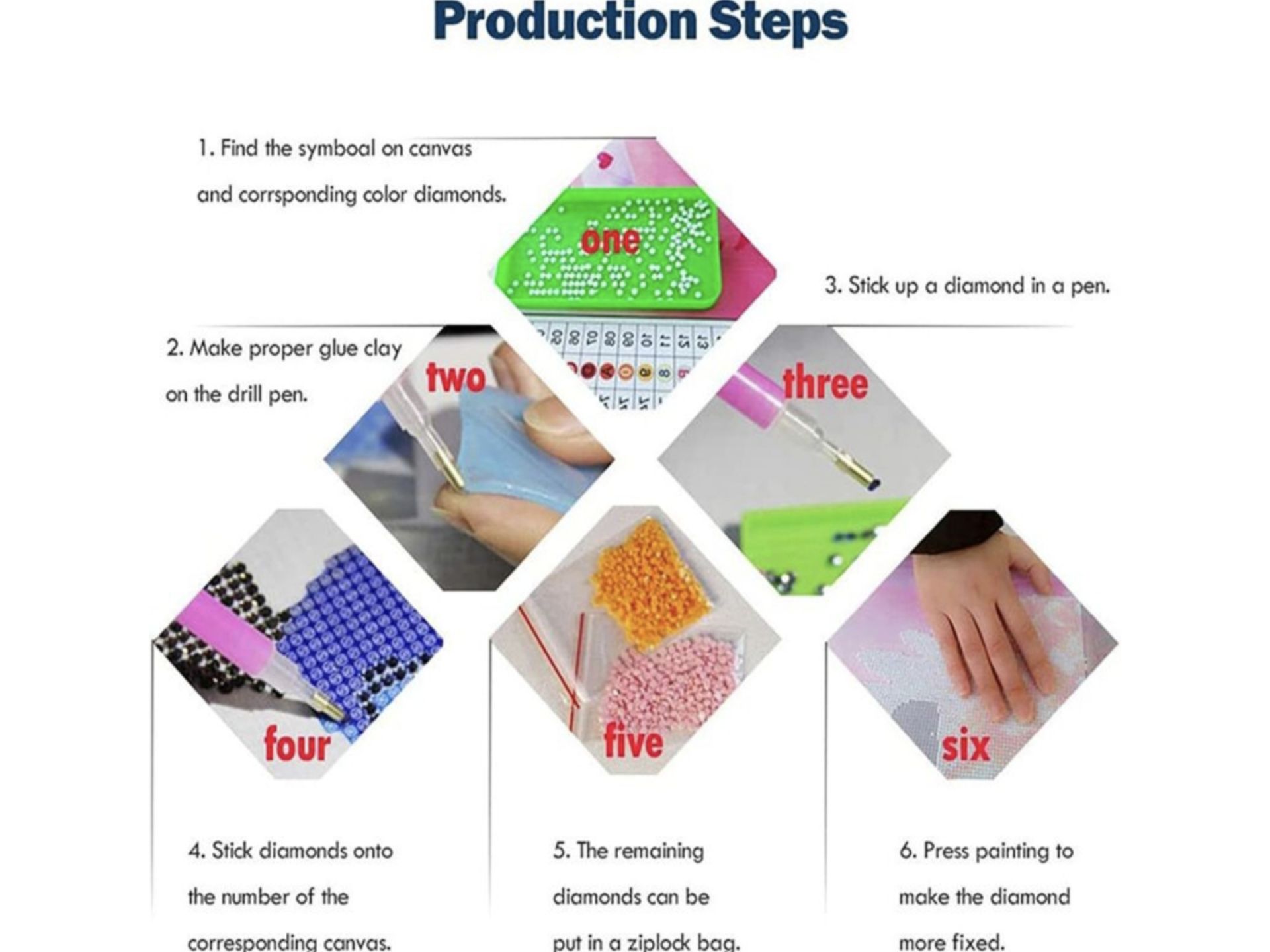 در این بازی میبایست ابتدا نوک قلم را داخل چسب صورتی رنگ فرو برده و مقداری از چسب را پانچ کنید اعداد روی تابلو بیانگر رنگ الماس ها میابشد باید بسته مربوط به اعداد را داخل سینی پلاستیکی ریخته و با تکان دادن سینی آنها را صاف کنید حالا به کمک قلم هر یک از الماس ها را بر روی عدد مربوطه قرار میدهیم در انتها تابلو زیبایی با تمرکز کودک دلبندتان به یادگار خواهید داشت