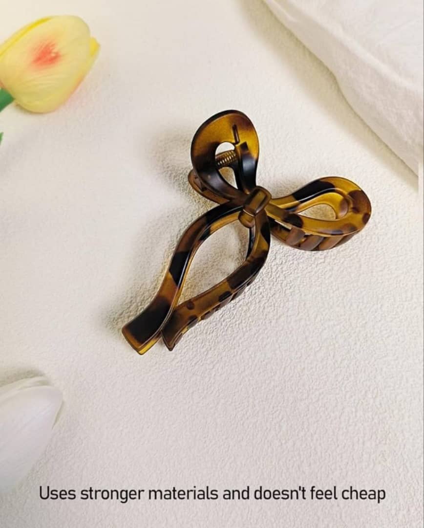 کلیپس مو با طراحی پاپیونی و طرح پلنگی، در سه رنگ جذاب مشکی، عسلی و نارنجی – انتخابی خاص برای استایلهای روزمره یا مهمانی.