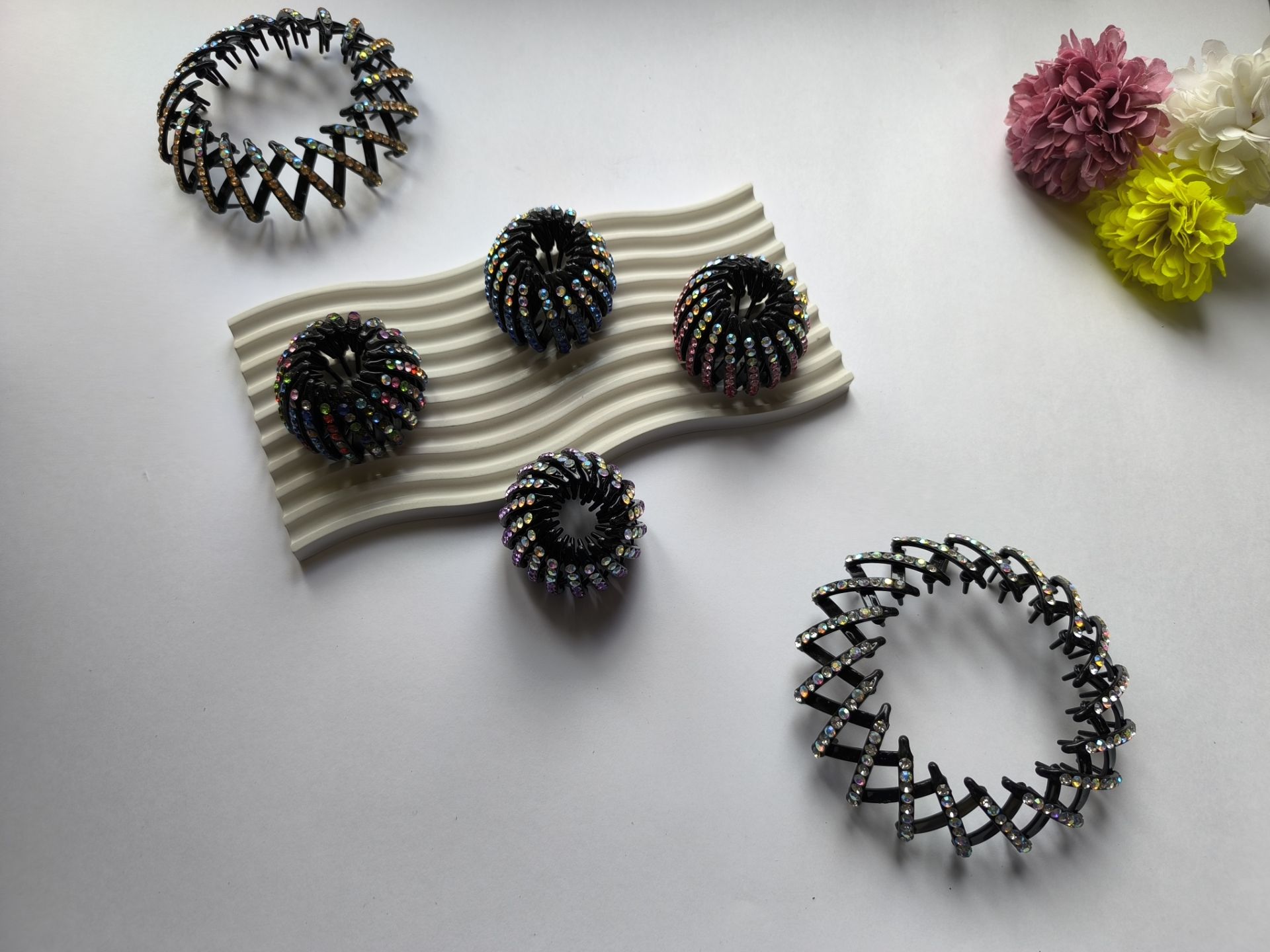 این کلیپس با نگین های رنگارنگ و درخشان تزیین شده و برای بستن موها به صورت گوجه ای و یا دم اسبی بسیار مناسب است.