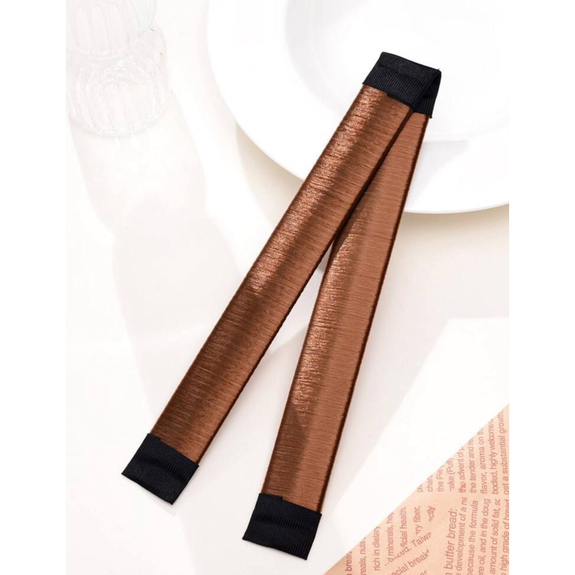 بامتل خطکشی آرانیس از پارچه متالیک براق با دوخت خطی ساخته شده است؛ مقاوم در برابر کشش و نرم در تماس با مو. قسمت قفل انعطافپذیر آن بهراحتی دور مو پیچیده میشود و استایل تمیز و لوکس ایجاد میکند. ظاهر متالیک بامتل باعث بازتاب نور و درخشش طبیعی روی موها میشود.